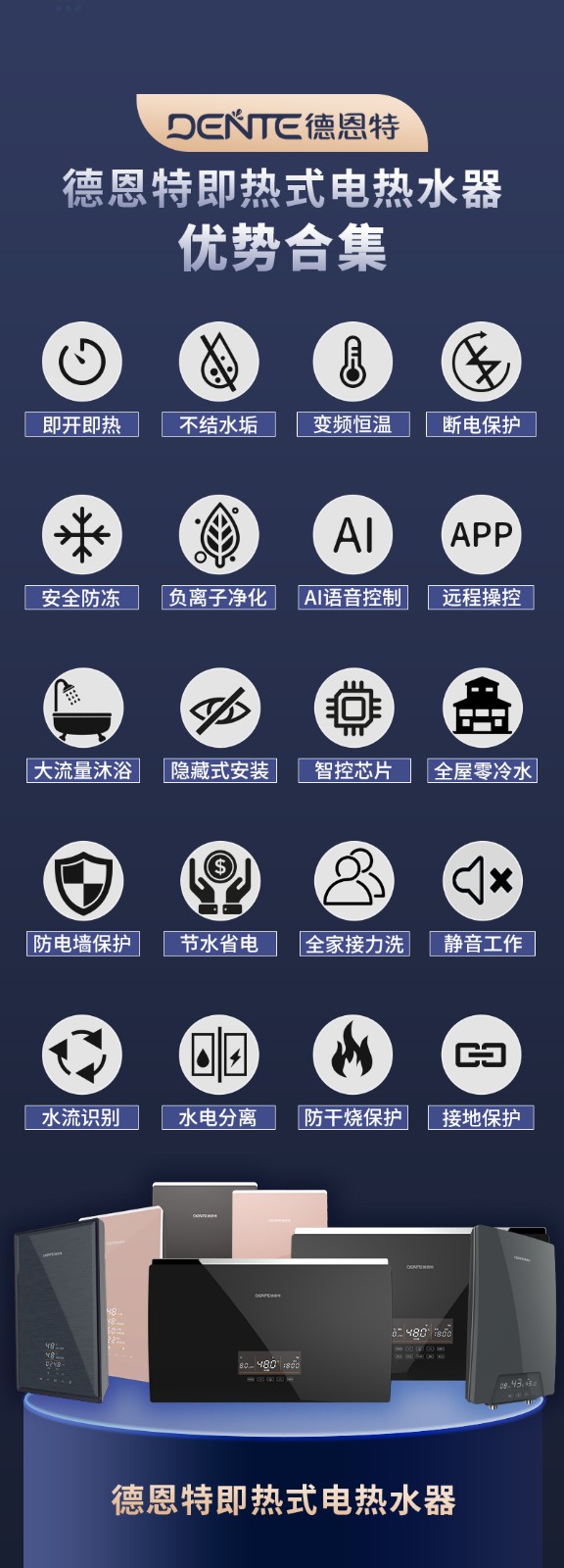 德恩特品牌旗下涵蓋即熱式電熱水器,速熱式電熱水器,快熱式電熱水器品牌和凈水機(jī)等