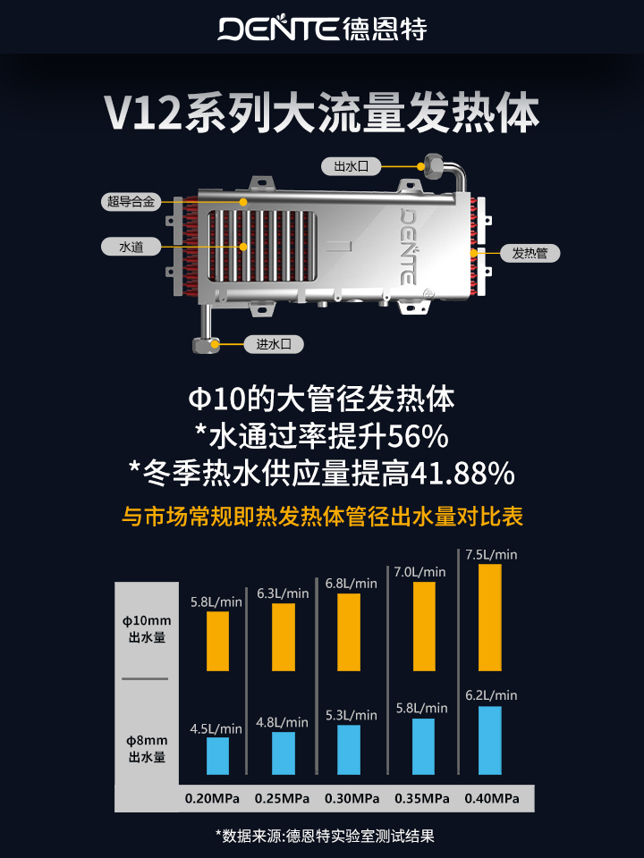 恒溫加熱沐浴:V12系列的發熱體,實現無角度安裝,將發熱體水路由傳統的1米延長至3.5米,大大降低了加熱管表面負荷功率,使熱傳導更充分,更均勻,更穩定,拒絕忽冷忽熱。大流量隨心浴:V12系列的發熱體Φ10的大管徑水通過率提升56%,冬季熱水供應量提高41.88%。(數據來源于德恩特實驗室)水電完全分離:在水路與加熱器之間采用高導熱性能的特質鋁合金鑄造,徹底顛覆了加熱管浸泡在水中的傳統,拒絕高溫結水垢,是真正的水電完全分離。